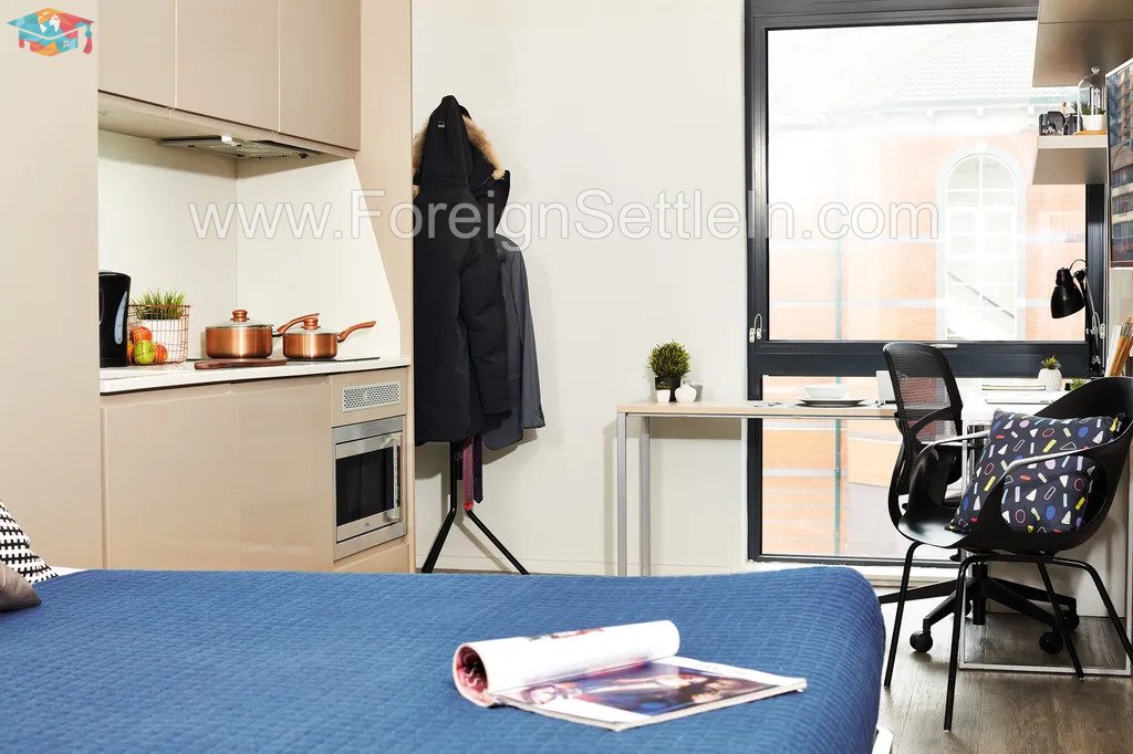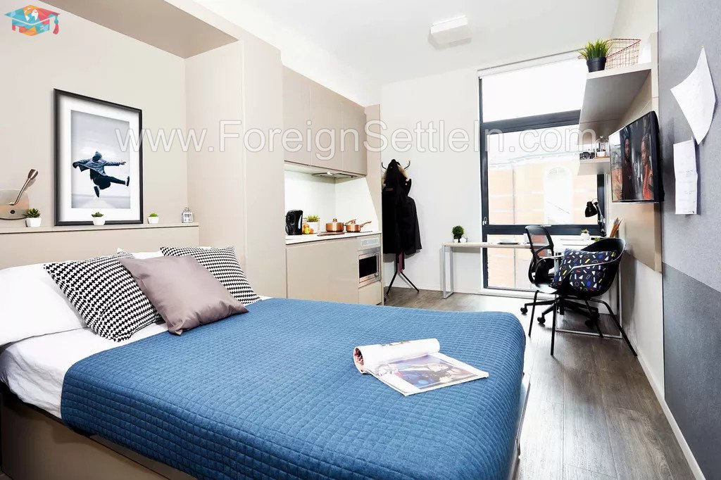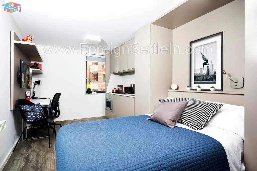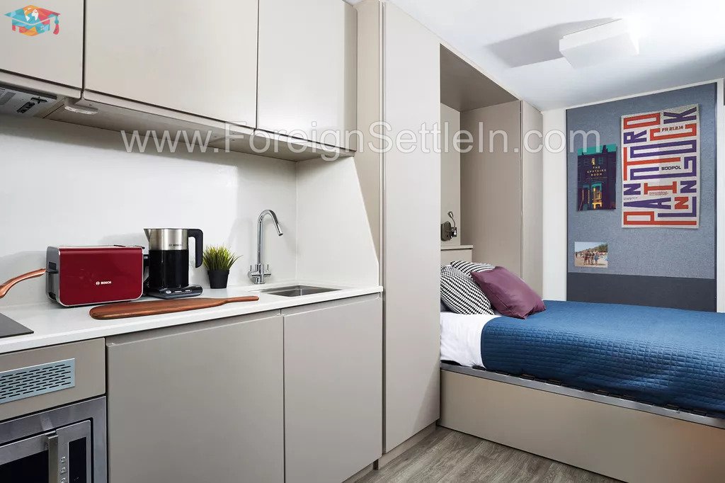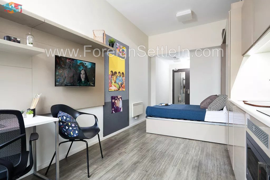 Every studio comes equipped with all the modern comforts, including a comfortable bed, a private bathroom, a closet, a desk for studying, a fitted kitchen, and lots of storage. Your stay will be safer and more secure thanks to amenities like free high-speed wifi, CCTV cameras, key fob access, and a 24-hour on-site team. A fully equipped gym, study space, and on-site coffee lounge are just a few of the outstanding amenities the facility offers to make your stay even more enjoyable.